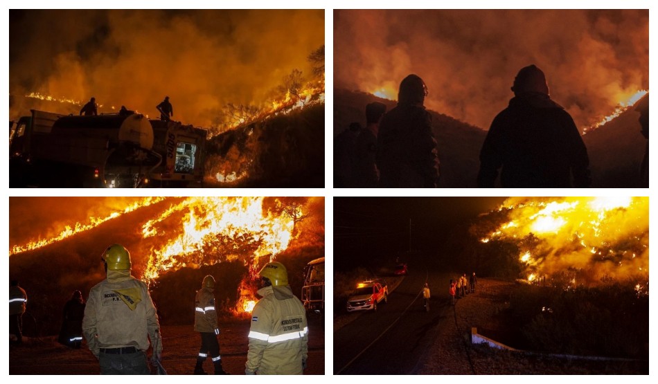 El siniestro originado en la zona conocida como “Cuestecilla” hacia el oeste del Km 27 de la Ruta Provincial N°4 se extendió rápidamente hacia noroeste por pastizales y arbustos de las laderas.