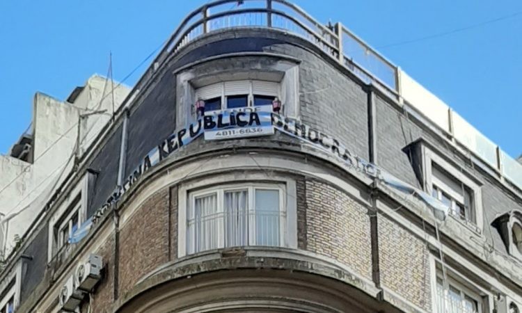 De acuerdo a una imagen difundida por redes sociales, los vecinos de la exmandataria desplegaron una bandera con los colores celeste y blanco y la inscripción “República Argentina Democrática”.