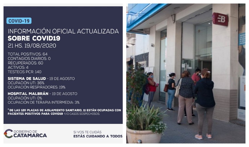 Hasta las 21 horas del miércoles 19 de agosto, no se han detectado nuevos casos positivos de coronavirus en la provincia de Catamarca. El total acumulado de casos positivos detectados se mantiene en 64, no se registraron pacientes recuperados. Por ello, teniendo en cuenta la sumatoria de casos recuperados hasta la fecha, solamente 4 casos se consideran casos activos.