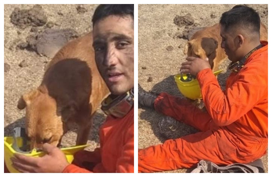 En medio del cerro, Emanuel divisó a un perro que deambulaba por la zona escapando del frente del fuego. No dudó un instante. Tomó su casco, lo llenó de agua, y se la ofreció al exhausto animal, que pudo saciar su sed y quizá salvar su vida.