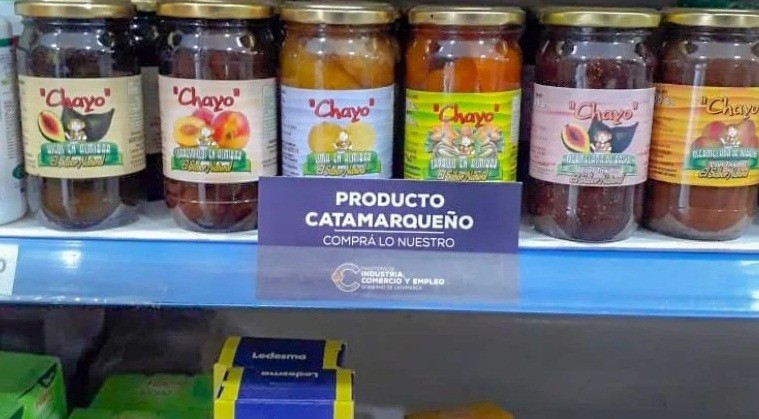 Con carteles indicativos que rezan “Producto catamarqueño. Comprá lo nuestro”, góndolas de importantes supermercados de la provincia exhiben para la venta al público diferentes productos fabricados por empresas catamarqueñas.