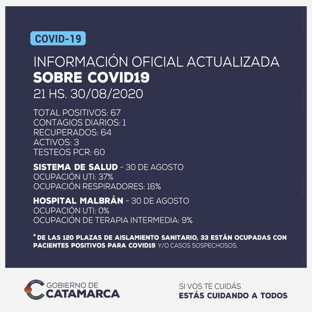 Hasta las 21 horas del domingo 30 de agosto, se ha detectado un (1) nuevo caso positivo de Coronavirus en Catamarca, que ya se encuentra aislado en el Hospital Malbrán. Se trata de una persona que ingresó a la provincia después de estar 6 meses en Salta por cuestiones laborales.