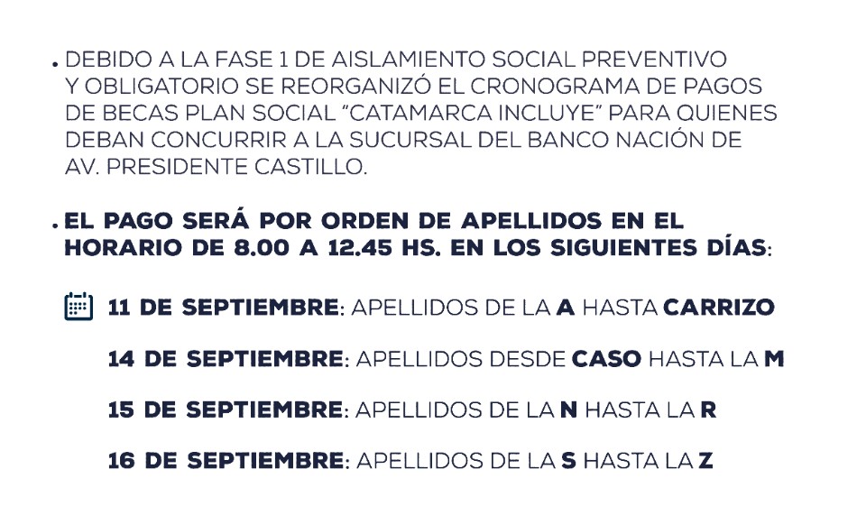 El Ministerio de Planificación y Modernización informa que debido a que rige Fase 1 de Aislamiento Social Preventivo y Obligatorio dispuesto por el Ejecutivo Provincial, se reorganizó el cronograma de pagos de becas Plan Social “Catamarca Incluye” de septiembre para quienes no posean tarjeta de débito y deban concurrir únicamente a la Sucursal del Banco Nación en Avenida Presidente Castillo S/N° de Capital.