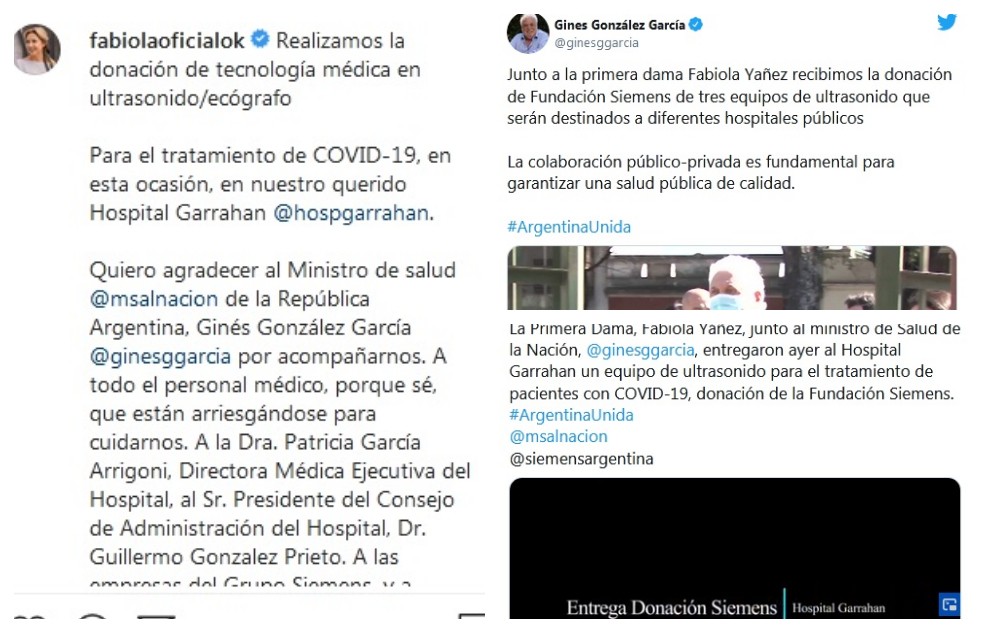Sin embargo, al indagar en las redes sociales de los beneficiarios de las donaciones y hasta del propio ministro de Salud de la Nación, queda claro desde el inicio que el rol de la Primera Dama en el acto fue protocolar, ya que ofició de intermediaria para que se efectuara la entrega de la Fundación Siemens.