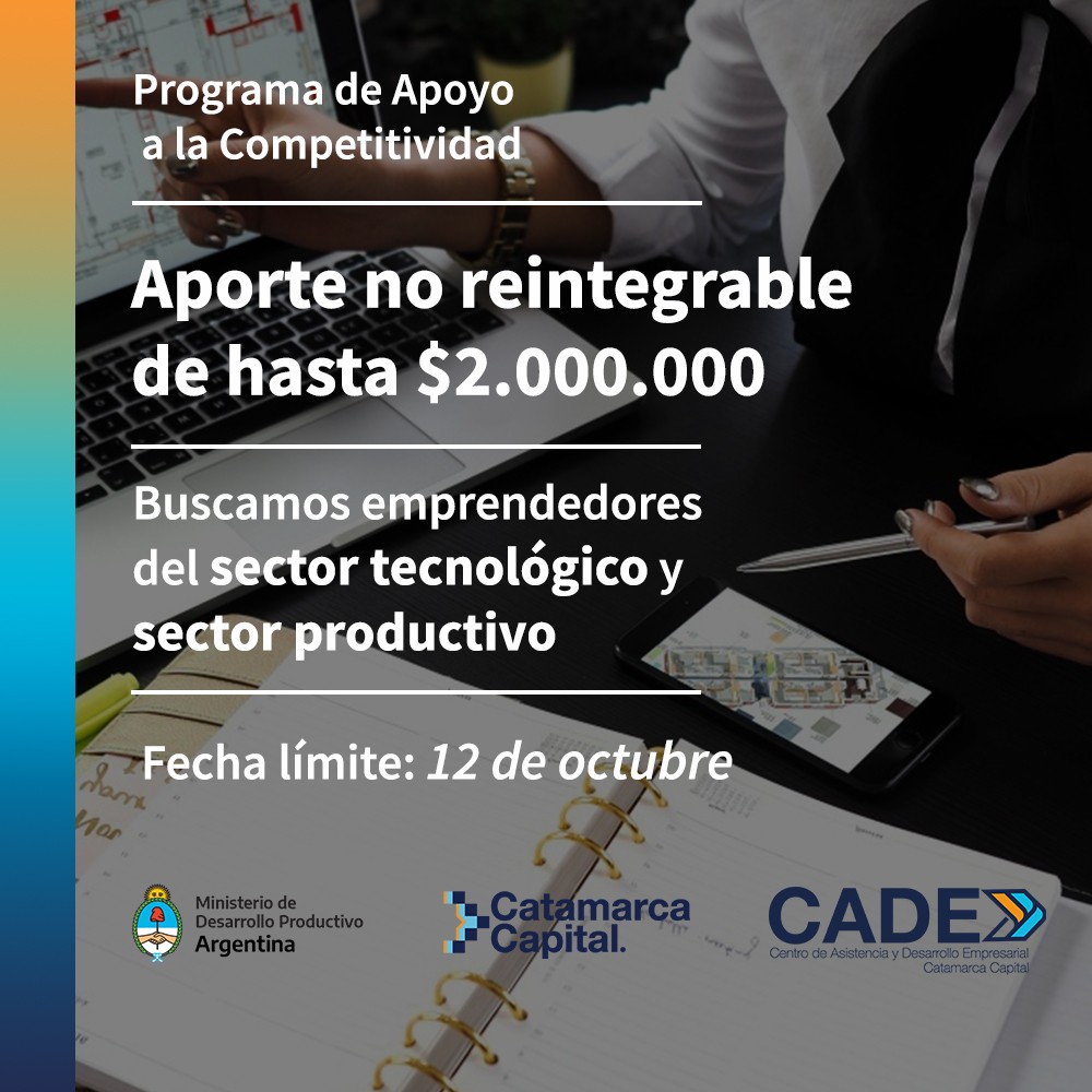 El Centro de Asistencia Empresarial (CADE) de la Secretaría de Turismo y Desarrollo Económico de la Municipalidad de Catamarca Capital, busca a emprendedores del sector tecnológico y productivo para acceder a un aporte no reintegrable (ANR) de hasta $2.000.000. Este aporte es parte del Programa de Apoyo a la Competitividad del Ministerio de Desarrollo Productivo de Nación. La fecha límite de postulación es el 12 de octubre.