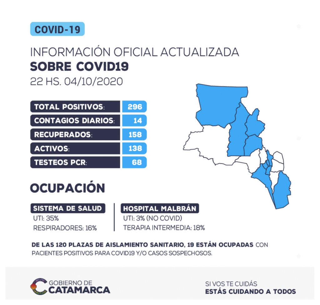 Hasta las 22 horas del domingo 4 de octubre, se han detectado 14 nuevos casos positivos de coronavirus en la provincia de Catamarca. El total acumulado de casos positivos detectados asciende a 296.