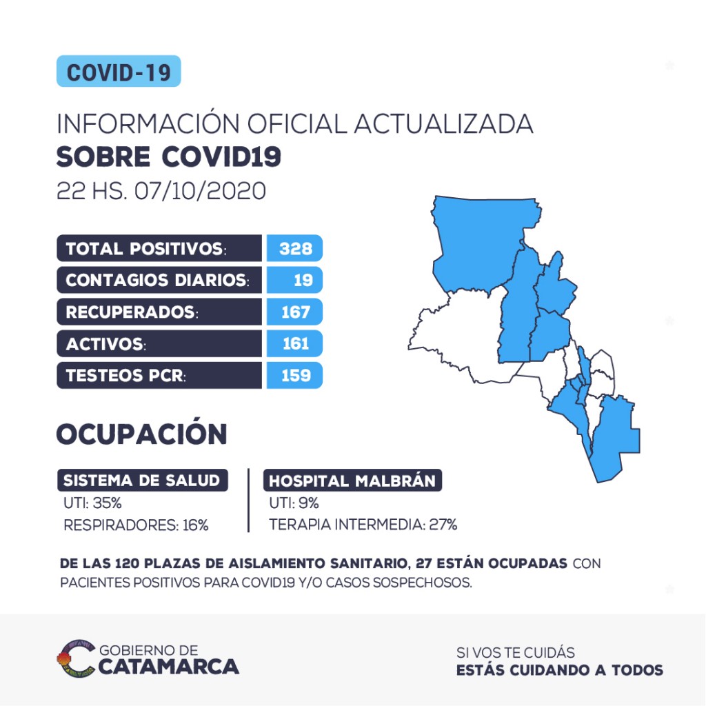 Hasta las 22 horas del miércoles 7 de octubre, se han detectado 19 nuevos casos positivos de coronavirus en la provincia de Catamarca. El total acumulado de casos positivos detectados asciende a 328.