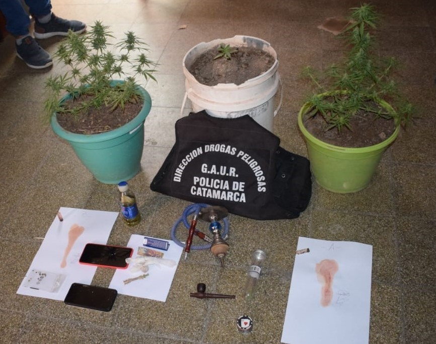 Este Domingo desde horas 11:00 y hasta las 15:30, Personal de la Comisaria Dptal. Belén, llevó a cabo un allanamiento dispuesto por el Juzgado de Control de Garantías a solicitud de la Fiscalía de la tercera circunscripción de Belén a cargo de la Dra. Rita Verónica Saldaño (Subrogante Legal). La medida judicial se materializo en una vivienda barrio El Medio de la ciudad de Belén, al momento de requisa los efectivos encontraron sustancias estupefacientes, por lo que se dio inmediata participación al GAUR (Grupo Antinarcóticos de la Unidad Regional N° 3), quienes bajo las directivas del Juzgado Federal de la provincia de Catamarca, se llevó a cabo el secuestro de; tres platas de la variedad cannabis sativa (Marihuana) dos de aproximadamente 40 cm de altura, y la restante de 10 cm aproximadamente; dieciocho (18) semillas de cannabis sativa Marihuana; un picador de metal para Marihuana; dos pipas; un tubo de plástico transparente conteniendo en su interior una sustancia herbácea triturada de características similares a la cannabis sativa marihuana la cual fue sometida a una prueba orientativa de campo arrojando resultado POSITIVO, con un peso de (6,6 grs); un frasco de alcohol de 250 ML conteniendo en su interior hojas de cannabis sativa; y la suma de mil cien pesos $1100 moneda nacional. Por hecho de mención dos personas mayores de edad, fueron alojadas en la Dependencia Policial a disposición de la Justicia ordinaria. Tomo intervención Juzgado Federal de la Provincia de Catamarca a cargo del Dr. Miguel Ángel Contreras: Secretaria a cargo del Dr. Luis Alberto Baracat Marenco.