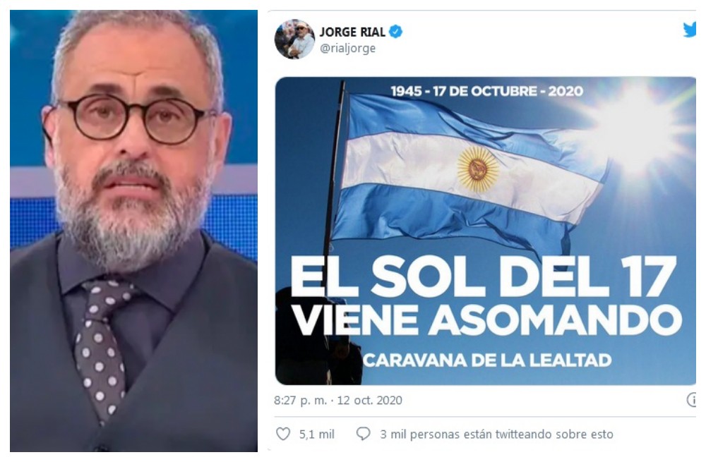 Jorge Rial hizo público su apoyo a la marcha en favor del Gobierno Nacional, que se llevará a cabo del próximo sábado 17 de octubre, en conmemoración a los 75 años del Día de la Lealtad. El conductor compartió el flyer de la convocatoria en su cuenta de Twitter.