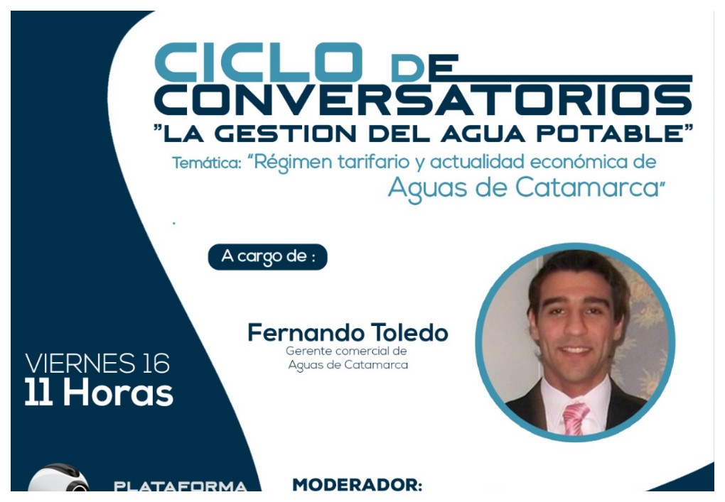 Aguas de Catamarca continúa con el ciclo de conversatorios y charlas informativas denominadas “La gestión del agua potable”. En esta oportunidad la charla estará a cargo del CPN Fernando Toledo, Gerente Comercial de Aguas de Catamarca, quien desarrollará la temática “Régimen tarifario y actualidad económica” en donde los usuarios podrán informarse sobre la actualización de tarifas y además conocer más sobre el sistema de facturación.