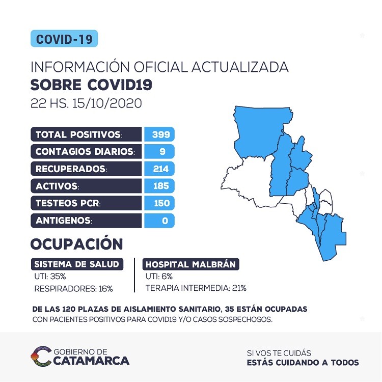 Hasta las 22 horas del jueves 15 de octubre, se han detectado 9 nuevos casos positivos de coronavirus en la provincia de Catamarca. El total acumulado de casos positivos detectados asciende a 399.