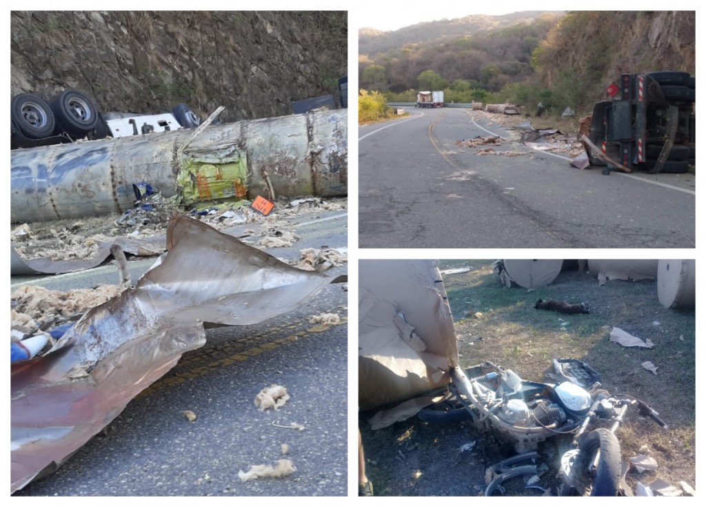 Uno de los camiones llevaba bobinas de papel, que es lo que se ve. En la banquina habia dos motos estacionadas y fueron aplastadas por uno de los camiones sus propietarios no sufrieron consecuencias.
