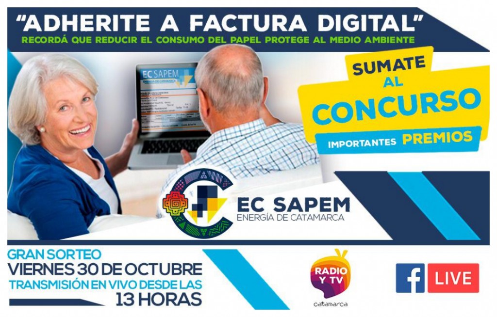 Este viernes finaliza el concurso "Adherite a la Factura Digital" de Energía de Catamarca SAPEM, el sorteo se realizará a través de la trasmisión en vivo por Catamarca Radio y Televisión y a través de la Fan Page de la Empresa.
