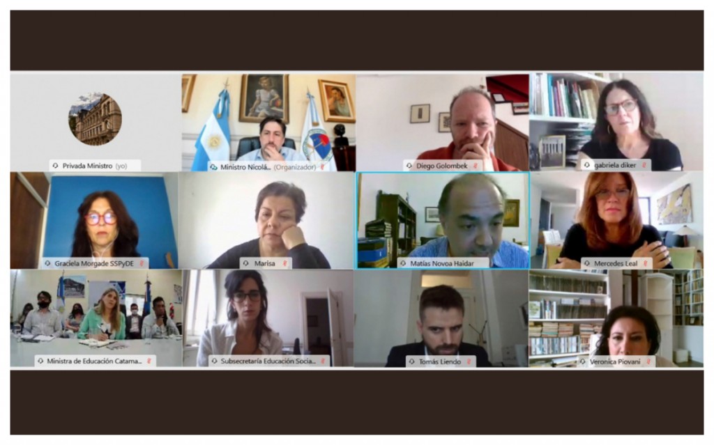 El titular de la cartera educativa nacional estuvo acompañado por integrantes de su Gabinete, mientras que la ministra catamarqueña incorporó al encuentro virtual al secretario de Planeamiento Educativo, Gustavo Soto, al secretario de Administración, Pablo Córdoba, los  directores de Programas Educativos, Luciano Guillou, de Programación Edilicia, Ana Hernández, de Nivel Inicial, Nancy Díaz, de Educación Especial, Laura Romero y de Gestión Privada, Claudia Madina.