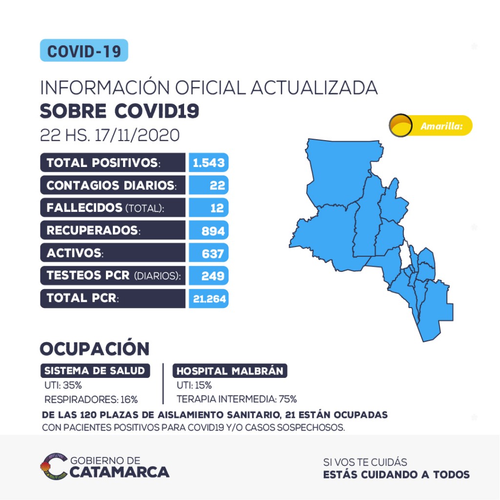Hasta las 22 horas del martes 17 de noviembre, se han detectado 22 nuevos casos positivos de coronavirus en la provincia de Catamarca. El total acumulado de casos positivos detectados asciende a 1.543.