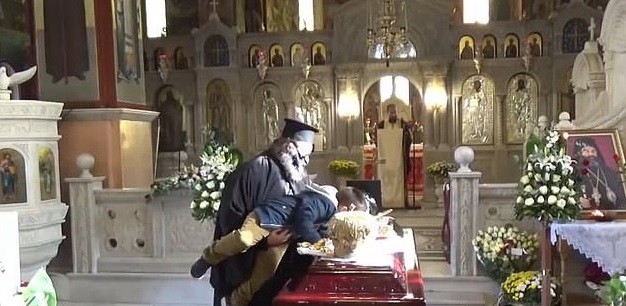 Un sacerdote ortodoxo provocó indignación en las redes luego de que alzara a un niño para besar el ataúd de un obispo que murió de coronavirus.