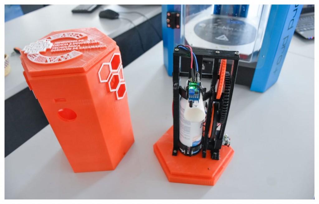 Este modelo, creado por el Ministerio, está confeccionado en su totalidad por impresoras 3D y emplea componentes de bajo costo como un motor de 5 voltios (similar a los que se usan en un auto de juguete), un sensor de infrarrojo para detectar el movimiento de la persona que se acerca y un juego de engranajes que permiten accionar por un momento el interruptor o botón del aerosol.