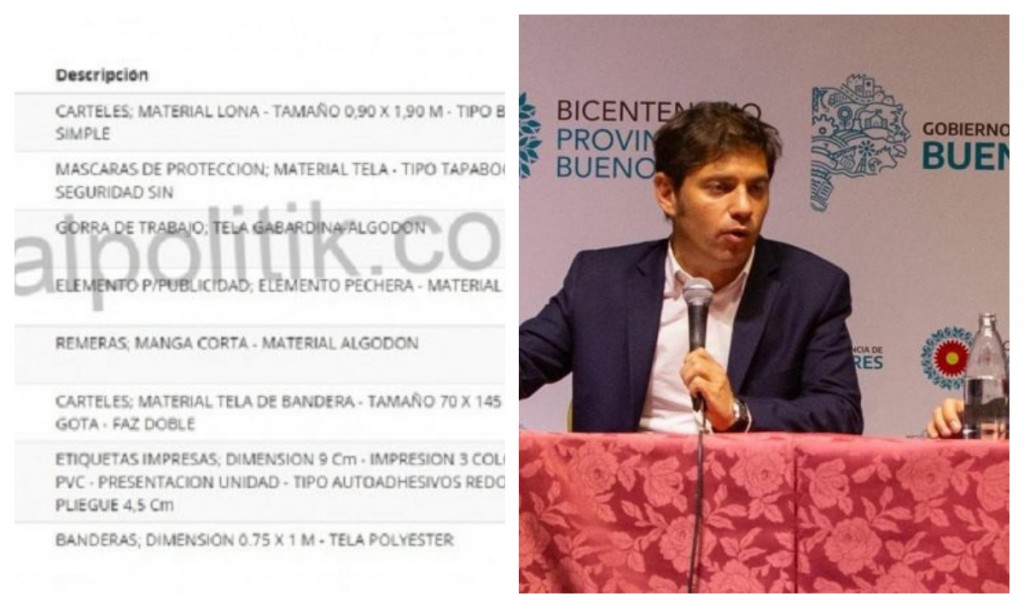 En efecto, se trata de banderas tipo gota, banderas horizontales, remeras, tapabocas, pecheras, gorras, frascos de alcohol en gel, potes de protector solar, calcomanías de gran tamaño y otras para identificar vasos y mates, gazebos y banners, que ostentarán la publicidad de su propio ministerio y, fundamentalmente, del gobierno de Kicillof.