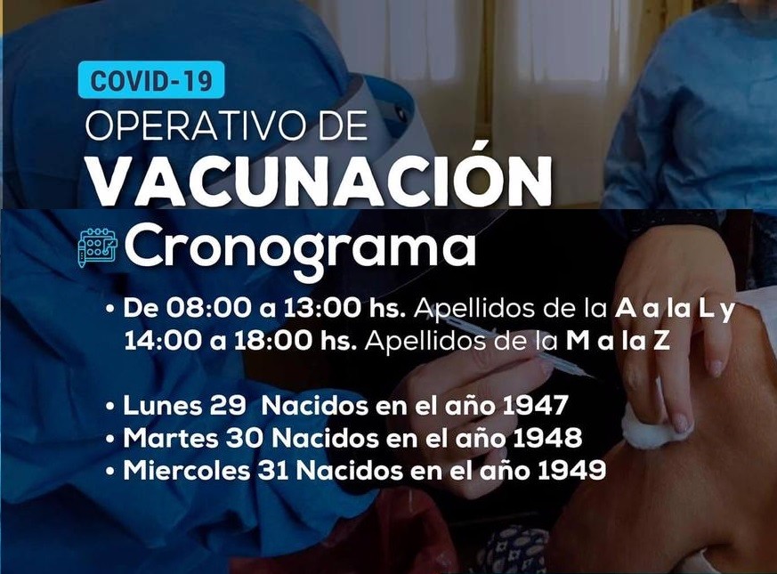 Desde el lunes y hasta el día miércoles deben presentarse en el Nodo Predio Ferial todas aquellas personas nacidas en el año 1947, 1948 y 1949 con domicilio en ciudad Capital, por la mañana (de 8 a 13 horas) aquellas personas cuyo apellido comience con la A hasta la L inclusive, y por la tarde (de 14 a 18 horas), las que tengan apellido que comienzan con las letras de la M a la Z, de acuerdo al siguiente cronograma: