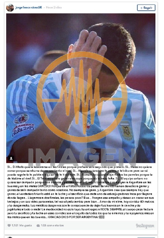 Si... Di María quiere lesionarse en las finales porque prefiere salir segundo que primero. Si... Messi no quiere correr porque se aburre de marear tanto al rival. Si... Higuaín quiere tirar la pelota a la tribuna para ver si puede regalarle la pelota a alguien de la hinchada. Si... Romero no quiere atajar todos los penales porque le da lástima el rival. Si... El Tata no quiere ganar una copa porque no le hace falta. Si... El equipo entero no quiere ser campeón porque son buenos y piensan en el prójimo. A todos los que apoyan a Argentina en las buenas y en las malas GRACIAS! Porque en el fútbol todos los países del mundo tienen derecho a ganar y ganas de salir campeón tanto como nosotros. No siempre se gana, y Argentina cree que siempre hay que ganar, el verdadero triunfo está en la lucha y el sacrificio que cada uno de estos jugadores hace por llegar a donde llegan... Llegamos a dos finales, les parece poco? Bue... Pongan ese empeño y deseo en crecer en sus trabajos y en sus vidas personales, tal vez el país cambie para bien... Amor de mi alma, hoy corriste 40 metros y te desgarraste, tus malditos desgarros son la consecuencia de dejar tus huevos en la cancha y de jugártelas a todo o nada! La mediocridad no es lo tuyo, te entregas al 100% SIEMPRE, el cuerpo pasa factura pero tu sacrificio y tu lucha en esas corridas son el orgullo de todos los que te amamos y te apoyamos mas en las malas que en las buenas... GRACIAS DIOS POR SER ARGENTINA!