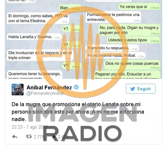 Jorge Lanata salió a cruzar al jefe de Gabinete, Aníbal Fernández, quien se anticipó al informe de esta noche de Periodismo Para Todos (PPT) y afirmó haber sido extorsionado por la producción del programa a partir de un mail de dudosa procedencia. En diálogo con Clarín, el conductor negó rotundamente la denuncia del precandidato a gobernador por el kirchnerismo, al tiempo que adelantó parte del contenido que se verá en la emisión por El Trece, centrado en el triple crimen de General Rodríguez y el negocio de la efedrina.