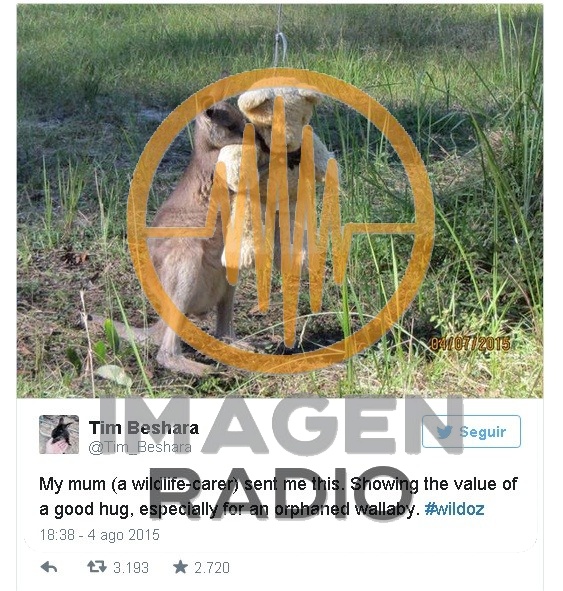 La foto la publicó en Twitter Tim Beshara, un consejero ambiental de Tazmania, hijo de una mujer que en el estado australiano de Nueva Gales del Sur cuida animales huérfanos y silvestres. "Mi madre me envió esto. Mostrando el valor de un buen abrazo", escribió en la red social Beshara.