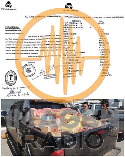 Los vecinos del Departamento ANCASTI convocados por la Municipalidad de Ancasti y el Honorable Concejo Deliberante hicieron llegar su ayuda solidaria a quienes sufrieron las consecuencias de las últimas lluvias en el Bañado de Ovanta, Departamento Santa Rosa. Los elementos fueron traslados por el Senador Provincial (M.C.) Ricardo R Boggio y recibidos por el Sacerdote Decano de la Región Este, Pbro. Humberto Carrizo.
