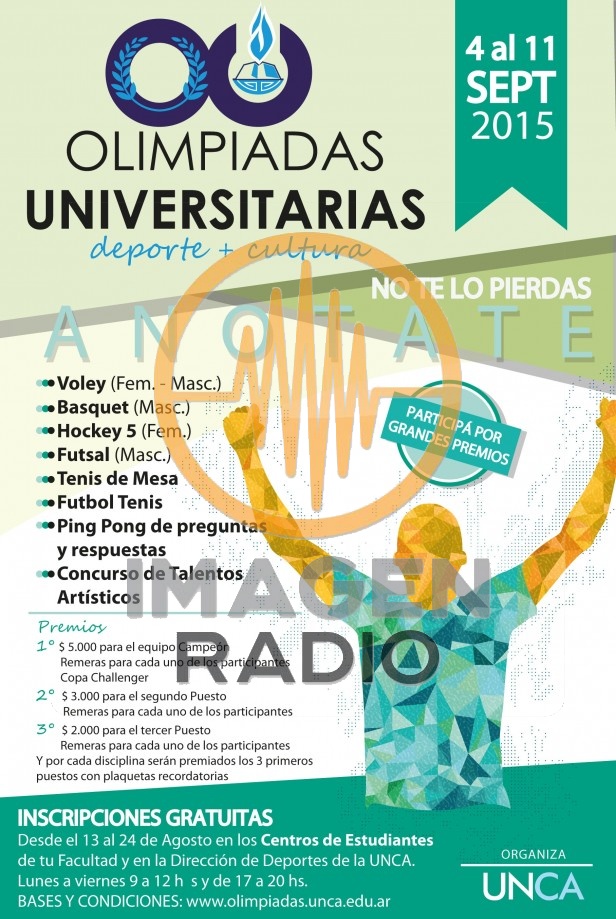 Organizadas por las Secretaría de Bienestar Universitario y Asuntos Estudiantiles, la Secretaría de Extensión de la UNCA y la Federación Universitaria de Catamarca inician hoy las Olimpíadas Universitarias deportes + cultura, en el marco del 43° aniversario dela UNCA.