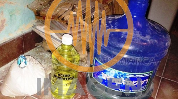 De la vivienda se procedió al secuestro de un tubo de gas de 45kg y dos botellas de acido muriático, elementos y precursores químicos que son utilizados para preparación de sustancia estupefaciente.