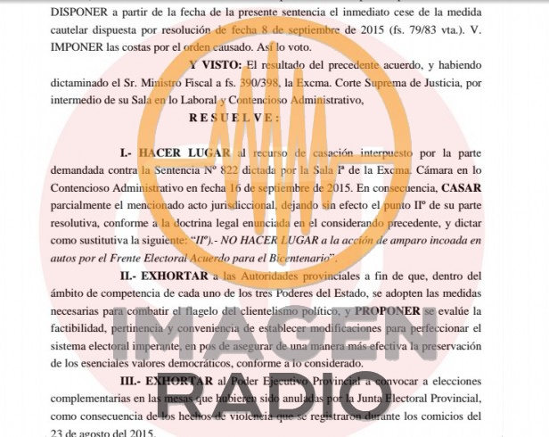- “En el marco de la adaptación o modalización de las normas procesales supletorias a los procesos constitucional y de la doctrina emergente del artículo 107 del Código Procesal Constitucional para los casos de máxima gravedad institucional como el venido en apelación, esta Corte hace suyos los fundamentos vertidos por el Ministerio Público Fiscal en el dictamen que corre agregado a fojas 390/398, por compartirlos en un todo (ver página 5, bajo el título “El clientelismo, por sí solo...”).