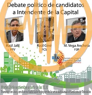 El martes 29 de septiembre, a partir de las 10.30 se llevará a cabo el segundo de los debates organizados por el Equipo de Pastoral Social de la Diócesis de Catamarca, en esta oportunidad con los candidatos a Intendente de la ciudad Capital de la provincia.