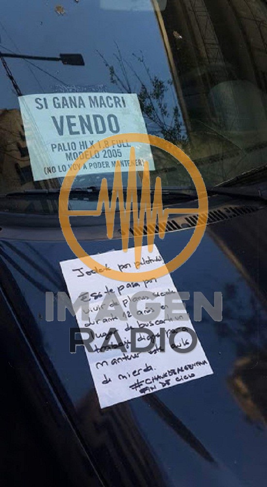 El dueño del vehículo avisa que si gana Macri va a vender el auto, porque pronostica no poder pagarlo. Mientras que un observador del mensaje decidió responder: “Eso te pasa por vivir de planes sociales por 12 años”, escribió en otro papel, en referencia al recurso fuerte del kirchnerismo.